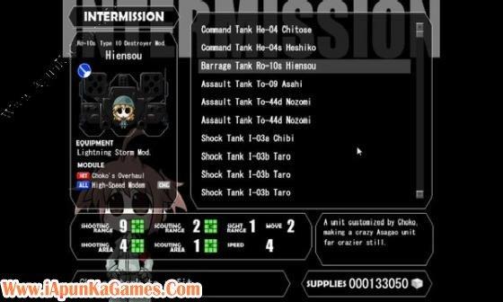 War of the Human Tanks Free Download ApunKaGames  Game Size: 878 MB is a story driven strategy game with a gameplay reminiscent of Battleship and Chess, featuring a story of war, loyalty, sacrifice and human shaped tanks. This story takes place in a land vaguely reminiscent of modern-day Japan.